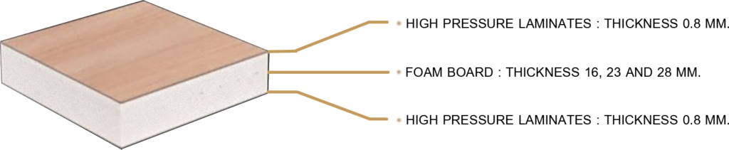 High pressure laminate material is strong and durable surface. Construction of material layer retards the growth of microbial completely, treated with melamine resin, phenolic resin and high efficiency microbial agent to be cured in thermosetting machine at high pressure of 9 mpa and temperature of 150c. These thickness come in 0.8 mm.